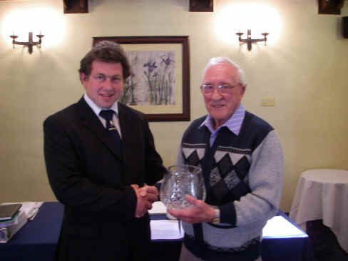 Tim Ward, Border fancier of Shrewsbury CBS, receives his award as 'Canary Exhibitor of the Year' from NCA President, Dennis Norton.